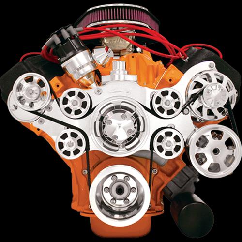 Billet Specialties Tru Trac serpentine systems witout A/C not only look awesome—they also perform! They are designed to increase the efficiency of the alternator and compressor by eliminating belt slippage. Order the unit tailored for fitment on your particular vehicle.