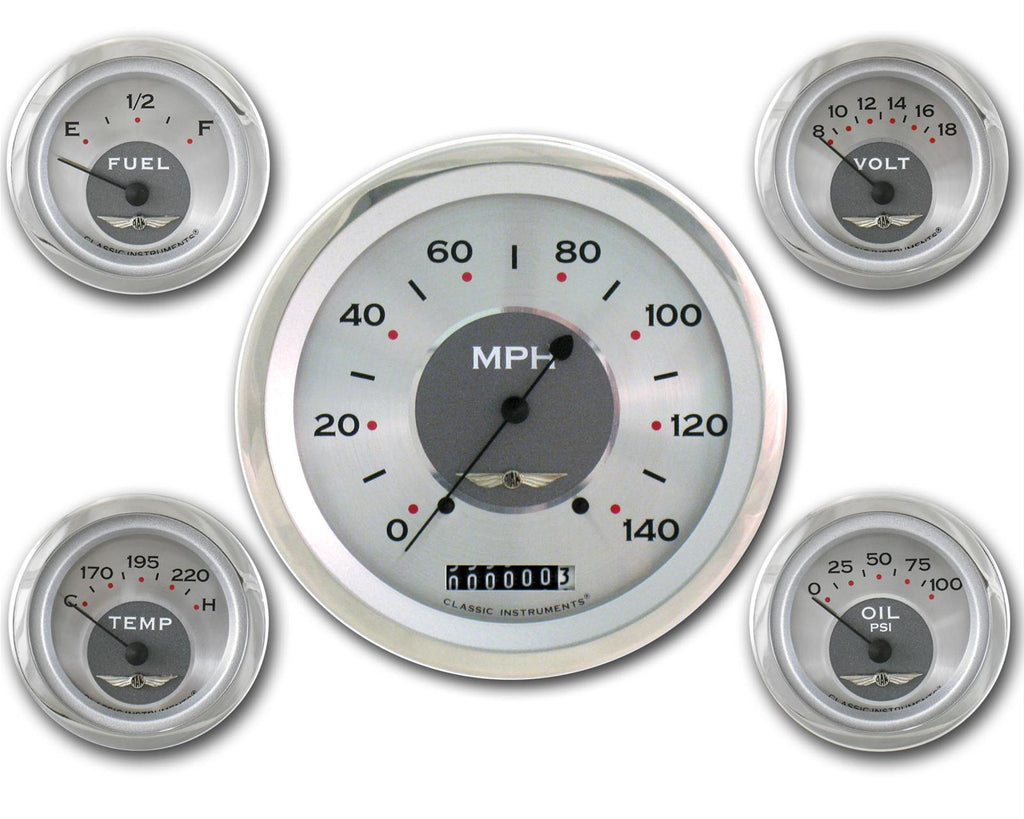 Beautiful designs from Tom Gale grace Classic Instruments All-American Series gauge sets and feature spun metal, curved glass, sleek pointers, polished stainless bezels, and a winged logo to illuminate your dash. Classic Instruments hand-assembles, inspects, re-inspects, calibrates, and tests every gauge before packaging and shipping them to ensure the perfection you're expecting. Sets are available in many gauge combinations and sizes. Complement your classic with the fine details of All-American Series gauge sets.Brand: Classic Instruments