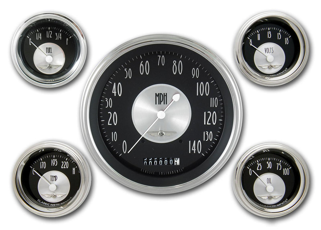 Classically simple and elegant, Classic Instruments All-American Tradition series gauge sets offer clean, time-honored style. Crafted with pride and perfection, these Classic Tradition prepackaged gauge sets feature spun metal central points with black backgrounds that allow the polished aluminum numbers and indices to radiate off of the face. White teardrop pointers, curved glass, polished stainless high-stepped bezels, and winged emblems complete their All-American design. Traditions are good, especially those that pass the test of time, and Classic Instruments All-American Tradition series gauge kits are your best choice to add a timeless look to your dash.Brand: Classic Instruments