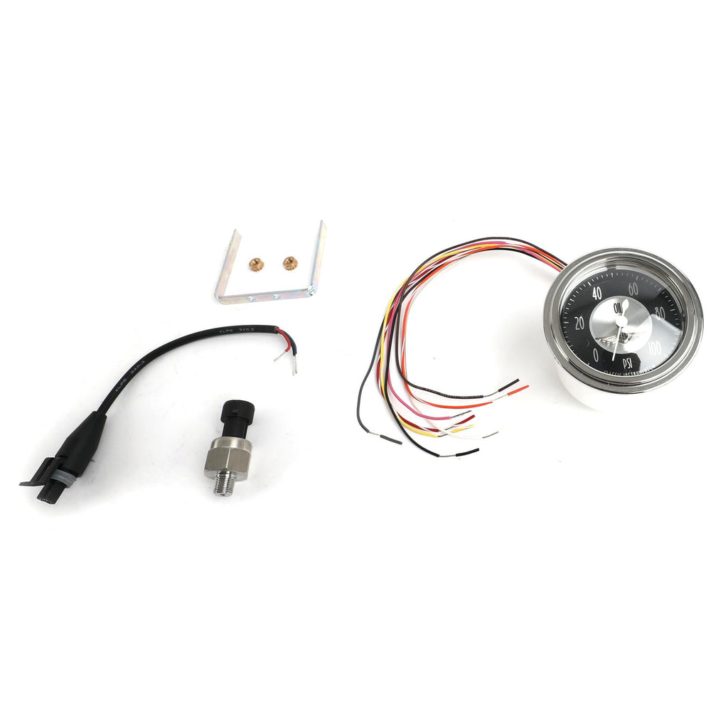 Notes: Features include pressure transducer, LED lighting, analog 0.5-4.5V DC output for data logging, push-button calibration, and rugged air core movement combined with microprocessor technology. Gauge has integrated red warning light, illuminates entire gauge red when activated. Installation hardware and wiring harness included.