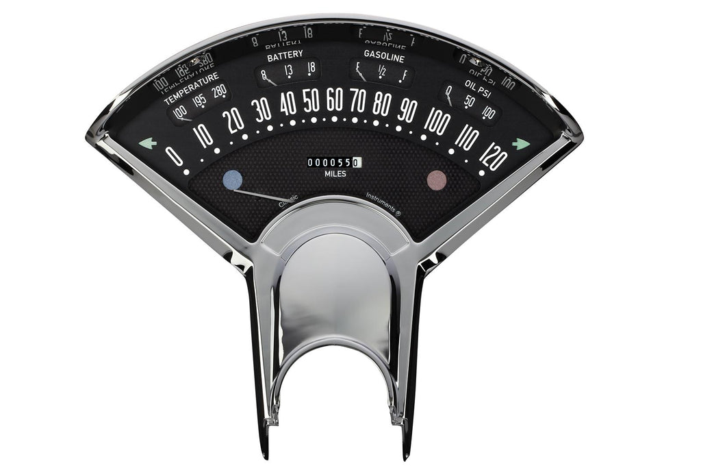 Classic Instruments Bel Era III package gauge sets offer the perfect combination of all-electric technology and the nostalgic stock look of 1955-56 Chevys. They are built with an injection-molded housing and dual-layer design, providing a speedometer, plus fuel level, oil pressure, water temperature, and volt gauges, all in one, easy-to-install, direct-fit cluster. The Bel Era III also features a fuel sender selector switch to easily choose the correct resistance range during installation.