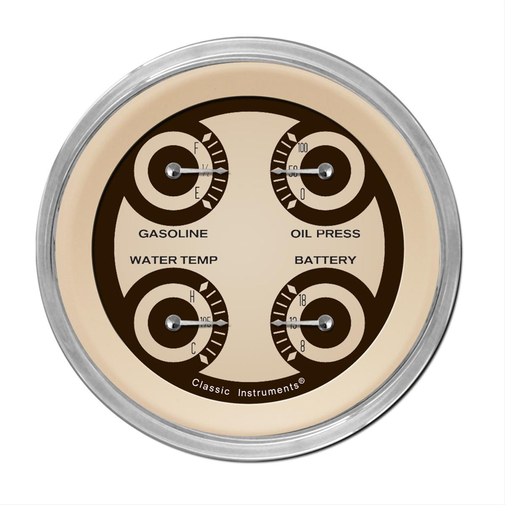 These Classic Instruments Nostalgia VT Series gauge sets feature a raised accent ring in the center that's complemented by a custom-built, handmade pointer. They include diamond indices that give them a rich, classic feel and their color combination gives them a nostalgic, vintage finish. Only Classic Instruments can bring you the class and elegance in the gauges you want and deserve with these Nostalgia VT Series gauge sets.Brand: Classic Instruments