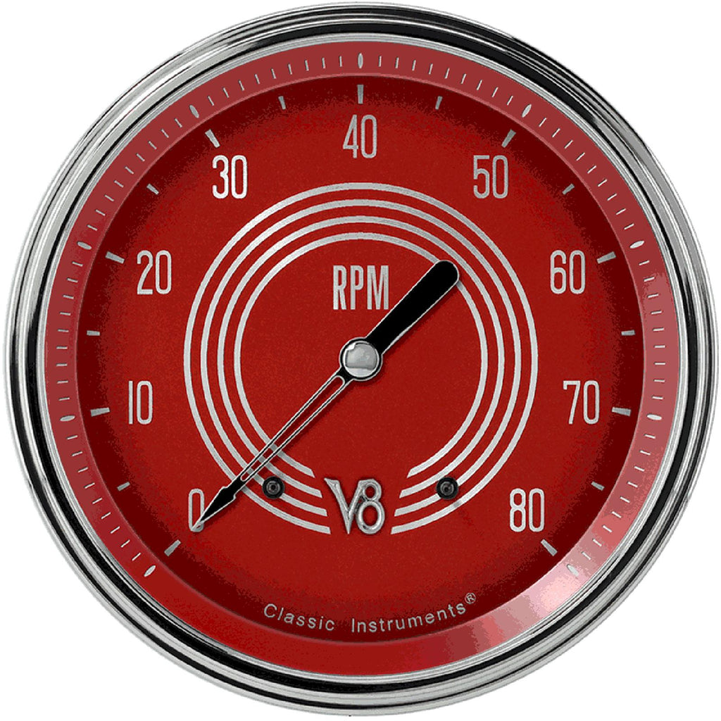 Step up the look of your hot rod or car with Classic Instruments V8 Red Steelie Series gauges. They feature a vivid red background with spun aluminum numbers and accent graphics that brightly bounce off of the red background. These gauges feature uniquely designed pointers for the V8 line, which is chrome plated and balanced for precision accuracy. Additional details within these instruments are laser-etched markings on the light diffuser ring, which adds a level of dimension and functionality. The etching corresponds with indices on the face and flows into a polished stainless high-step bezel that's crimped around an optic-grade curved lens to complete each of the gauges' overall design.Brand: Classic Instruments