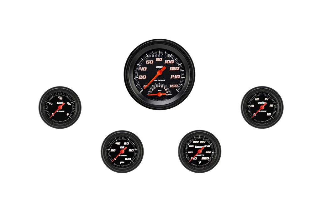 Classic Instruments Velocity Black Series gauge sets offer track-proven precision! These gauges provide accuracy and reliability for your street machine—and they're engineered to handle the abuse of competition. Features include large, easy-to-read numerals; non-reflective black bezels; metallic orange pointers; and black backgrounds. Velocity gauges are handcrafted for perfection and include the necessary sending units for installation. Sets are offered in several data and size combinations to fit your application. Gain a competitive edge at the track and on the street with Classic Instruments Velocity gauges on board.
