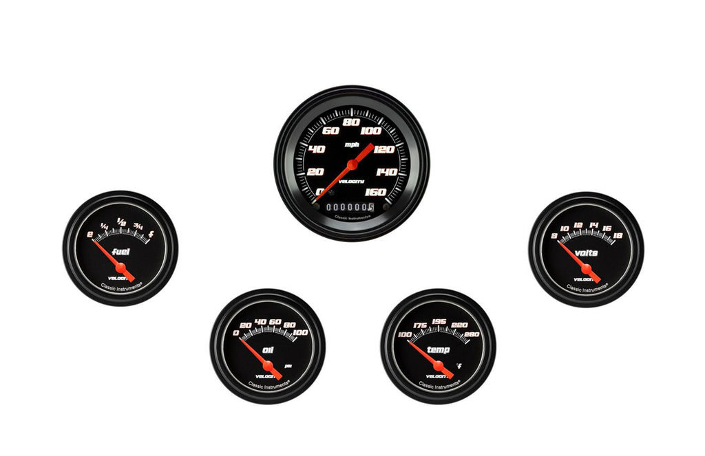 Classic Instruments Velocity Black Series gauge sets offer track-proven precision! These gauges provide accuracy and reliability for your street machine—and they're engineered to handle the abuse of competition. Features include large, easy-to-read numerals; non-reflective black bezels; metallic orange pointers; and black backgrounds. Velocity gauges are handcrafted for perfection and include the necessary sending units for installation. Sets are offered in several data and size combinations to fit your application. Gain a competitive edge at the track and on the street with Classic Instruments Velocity gauges on board.