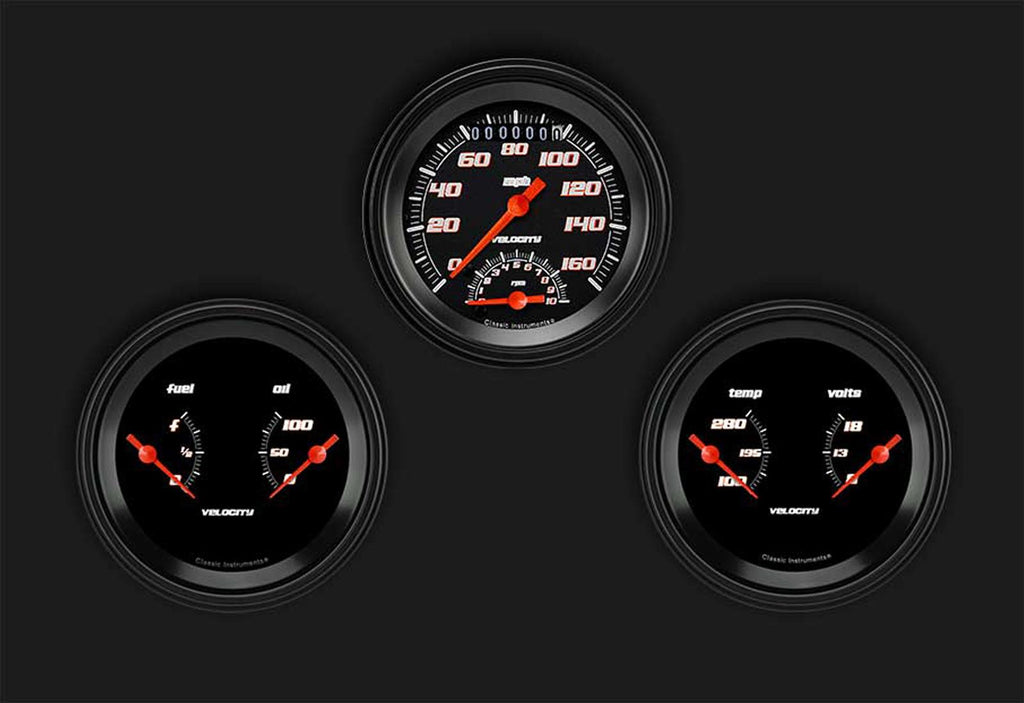 Classic Instruments Velocity Black Series gauge sets offer track-proven precision! These gauges provide accuracy and reliability for your street machine—and they're engineered to handle the abuse of competition. Features include large, easy-to-read numerals; non-reflective black bezels; metallic orange pointers; and black backgrounds. Velocity gauges are handcrafted for perfection and include the necessary sending units for installation. Sets are offered in several data and size combinations to fit your application. Gain a competitive edge at the track and on the street with Classic Instruments Velocity gauges on board.
