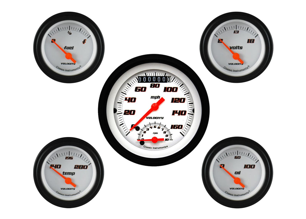 Classic Instruments Velocity Series gauge sets offer track-proven precision for your street machine, and they're engineered to handle the abuse of competition. With their big, easy-to-read numerals, non-reflective black bezels, metallic orange pointers, and your choice of black or white backgrounds, these gauges sets will send your dash racing with quality and innovation. The Velocity series gauge sets are handcrafted for perfection and include the necessary sending units for installation. Sets are offered in several combinations to fit your application. Gain a competitive edge at the track and on the street with Classic Instruments Velocity series gauge sets on board.