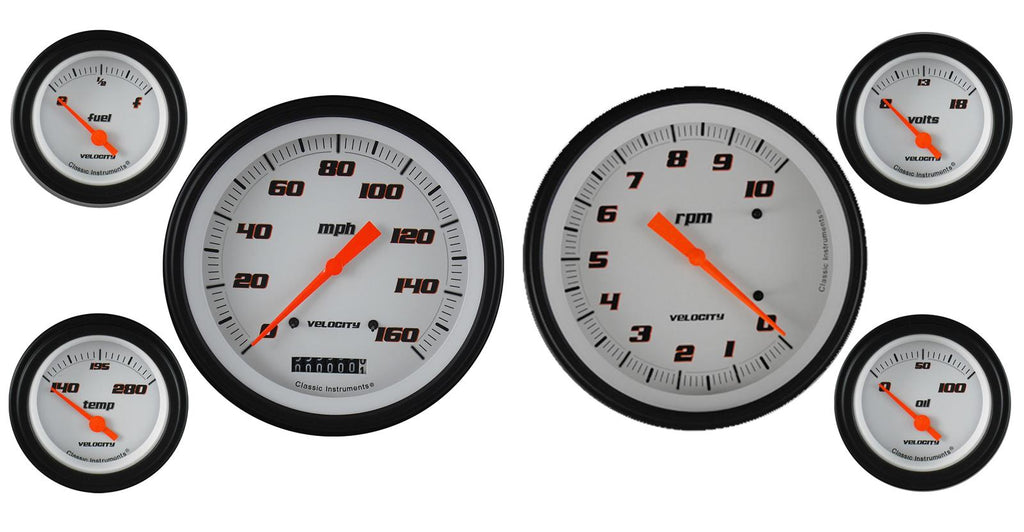 Classic Instruments Velocity Series gauge sets offer track-proven precision for your street machine, and they're engineered to handle the abuse of competition. With their big, easy-to-read numerals, non-reflective black bezels, metallic orange pointers, and your choice of black or white backgrounds, these gauges sets will send your dash racing with quality and innovation. The Velocity series gauge sets are handcrafted for perfection and include the necessary sending units for installation. Sets are offered in several combinations to fit your application. Gain a competitive edge at the track and on the street with Classic Instruments Velocity series gauge sets on board.