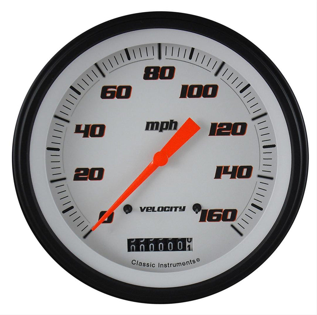 Pick up the pace with Classic Instruments Velocity Series speedometers. Big, easy-to-read numerals, non-reflective black bezels, metallic orange pointers, and your choice of black or white backgrounds send your dash racing with track-proven precision. Classic Velocity speedometers offer street rod builders accuracy and reliability, but they're also engineered to take the abuse of competition. Get an edge with the competitive advantage of Velocity Series tachometer from Classic Instruments.Brand: Classic Instruments