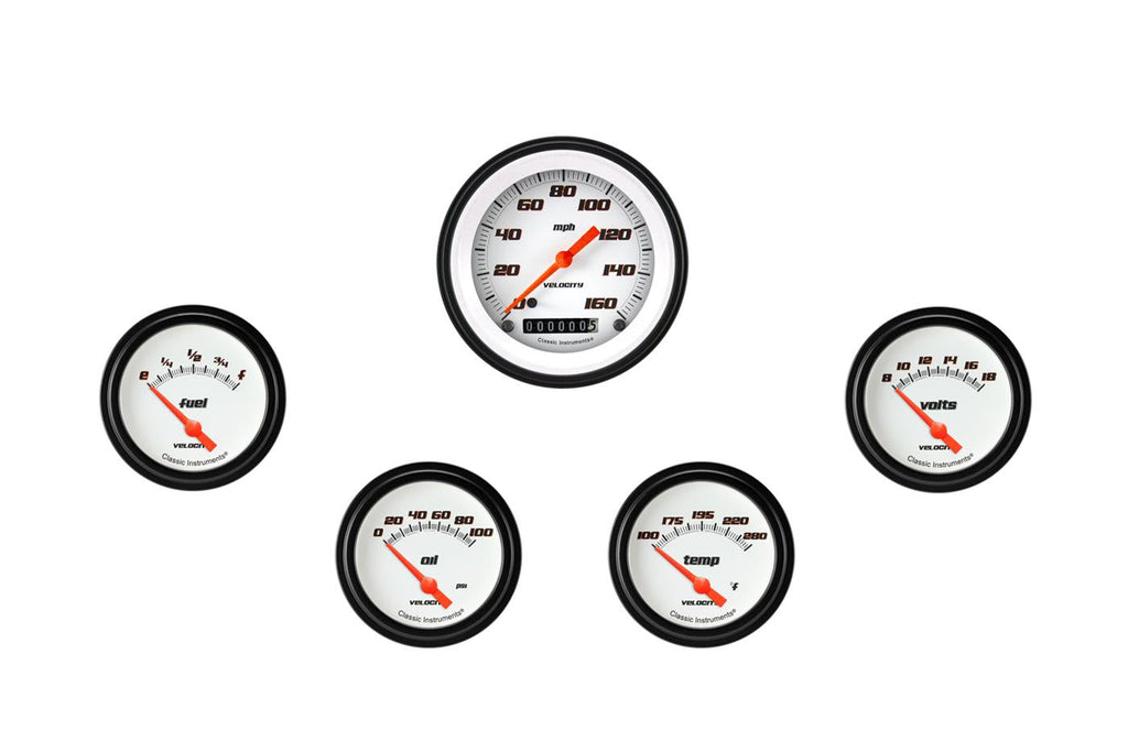 Classic Instruments Velocity White Series gauge sets offer track-proven precision! These gauges provide accuracy and reliability for your street machine—and they're engineered to handle the abuse of competition. Features include large, easy-to-read numerals; non-reflective black bezels; metallic orange pointers; and white backgrounds. Velocity gauges are handcrafted for perfection and include the necessary sending units for installation. Sets are offered in several data and size combinations to fit your application. Gain a competitive edge at the track and on the street with Classic Instruments Velocity gauges on board.