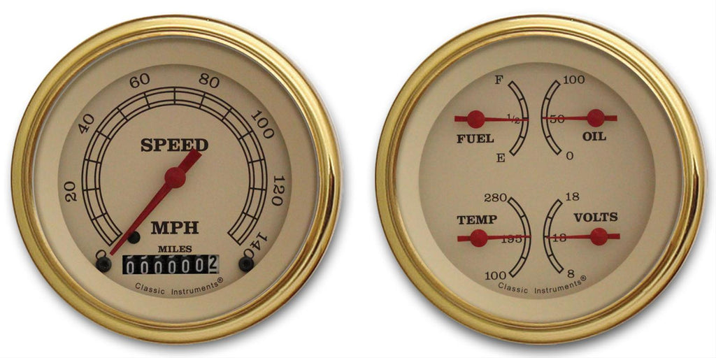 It was the beginning of a legacy--Vintage series gauge sets from Classic Instruments. Reminiscent of the golden age of motoring, and now powered by modern electronic technology, Classic's Vintage series gauges offer details from a bygone era that remain popular today. Their soft colors, antique numerals and indices, red crescent moon pointers, and curved glass will decorate your dash with timeless appeal. Handcrafted in America, these instruments are available in your choice of polished silver or gold bezels. The golden age was a simpler time of elegance, and Classic Industries brings it up to speed with their Vintage series gauge sets--the perfect finishing touch!Brand: Classic Instruments