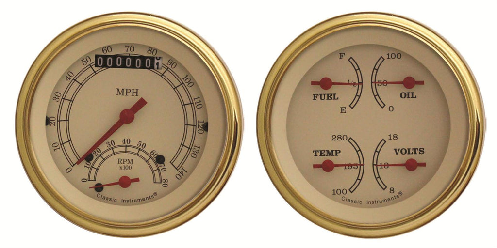 It was the beginning of a legacy--Vintage series gauge sets from Classic Instruments. Reminiscent of the golden age of motoring, and now powered by modern electronic technology, Classic's Vintage series gauges offer details from a bygone era that remain popular today. Their soft colors, antique numerals and indices, red crescent moon pointers, and curved glass will decorate your dash with timeless appeal. Handcrafted in America, these instruments are available in your choice of polished silver or gold bezels. The golden age was a simpler time of elegance, and Classic Industries brings it up to speed with their Vintage series gauge sets--the perfect finishing touch!Brand: Classic Instruments