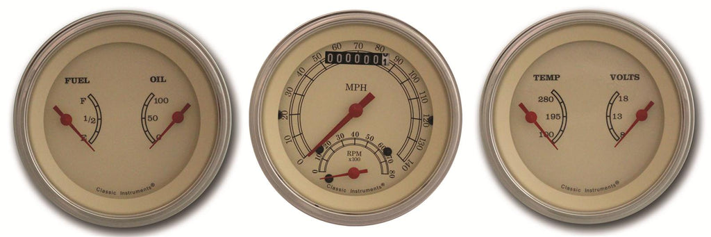 It was the beginning of a legacy--Vintage series gauge sets from Classic Instruments. Reminiscent of the golden age of motoring, and now powered by modern electronic technology, Classic's Vintage series gauges offer details from a bygone era that remain popular today. Their soft colors, antique numerals and indices, red crescent moon pointers, and curved glass will decorate your dash with timeless appeal. Handcrafted in America, these instruments are available in your choice of polished silver or gold bezels. The golden age was a simpler time of elegance, and Classic Industries brings it up to speed with their Vintage series gauge sets--the perfect finishing touch!Brand: Classic Instruments