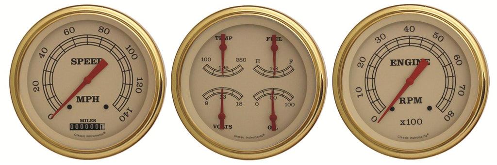 It was the beginning of a legacy--Vintage series gauge sets from Classic Instruments. Reminiscent of the golden age of motoring, and now powered by modern electronic technology, Classic's Vintage series gauges offer details from a bygone era that remain popular today. Their soft colors, antique numerals and indices, red crescent moon pointers, and curved glass will decorate your dash with timeless appeal. Handcrafted in America, these instruments are available in your choice of polished silver or gold bezels. The golden age was a simpler time of elegance, and Classic Industries brings it up to speed with their Vintage series gauge sets--the perfect finishing touch!Brand: Classic Instruments