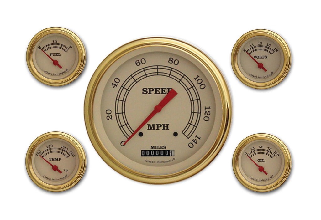 It was the beginning of a legacy--Vintage series gauge sets from Classic Instruments. Reminiscent of the golden age of motoring, and now powered by modern electronic technology, Classic's Vintage series gauges offer details from a bygone era that remain popular today. Their soft colors, antique numerals and indices, red crescent moon pointers, and curved glass will decorate your dash with timeless appeal. Handcrafted in America, these instruments are available in your choice of polished silver or gold bezels. The golden age was a simpler time of elegance, and Classic Industries brings it up to speed with their Vintage series gauge sets--the perfect finishing touch!Brand: Classic Instruments