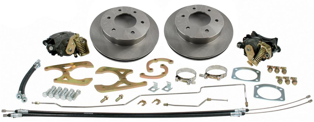 Classic Performance rear disc brake kits not only work with stock rear-ends, but they also bolt directly onto a 10- or 12-bolt rear-end. These kits include rotors, loaded calipers with a built-in E-brake, rubber hose kits, and all mounting hardware. The rotors are available in solid or cross-drilled and slotted surface, and they'll work with C-clip eliminators. Some modifications may be necessary, depending upon the application. Order the kit designed for fitment with your axle, flange, and wheel bolt pattern.Brand: Classic Performance