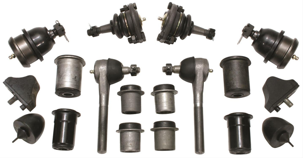 Don't overlook the front-end when rebuilding your classic vehicle; replace old worn-out bushings, ball joints, sleeves, and tie rod ends. These Classic Performance rubber front-end kits make it possible to achieve better-than-new performance for a modest price. Two types of kits are available for you to choose from. All rubber front-end kits include upper and lower ball joints, outer tie rod ends, control arm bushings, and strut rod bushings. End links sold separately. Complete rubber front-end kits also include inner tie rod ends, adjusting sleeves and idler arms. Order the kit recommended for your vehicle.Brand: Classic Performance