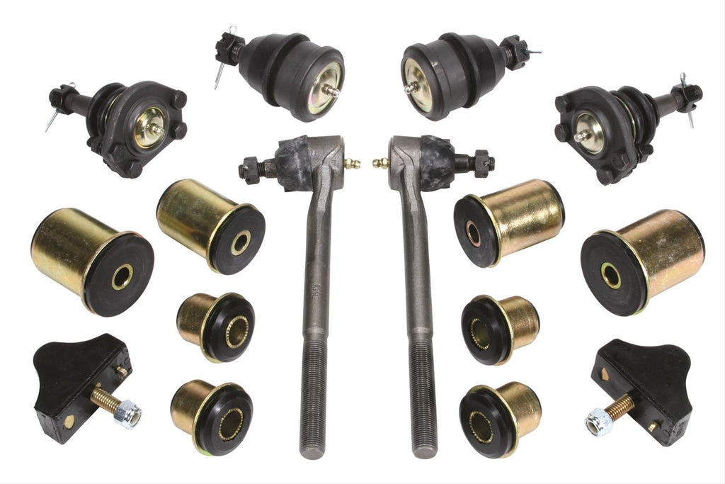 Don't overlook the front-end when rebuilding your classic vehicle; replace old worn-out bushings, ball joints, sleeves, and tie rod ends. These Classic Performance rubber front-end kits make it possible to achieve better-than-new performance for a modest price. Two types of kits are available for you to choose from. All rubber front-end kits include upper and lower ball joints, outer tie rod ends, control arm bushings, and strut rod bushings. End links sold separately. Complete rubber front-end kits also include inner tie rod ends, adjusting sleeves and idler arms. Order the kit recommended for your vehicle.Brand: Classic Performance