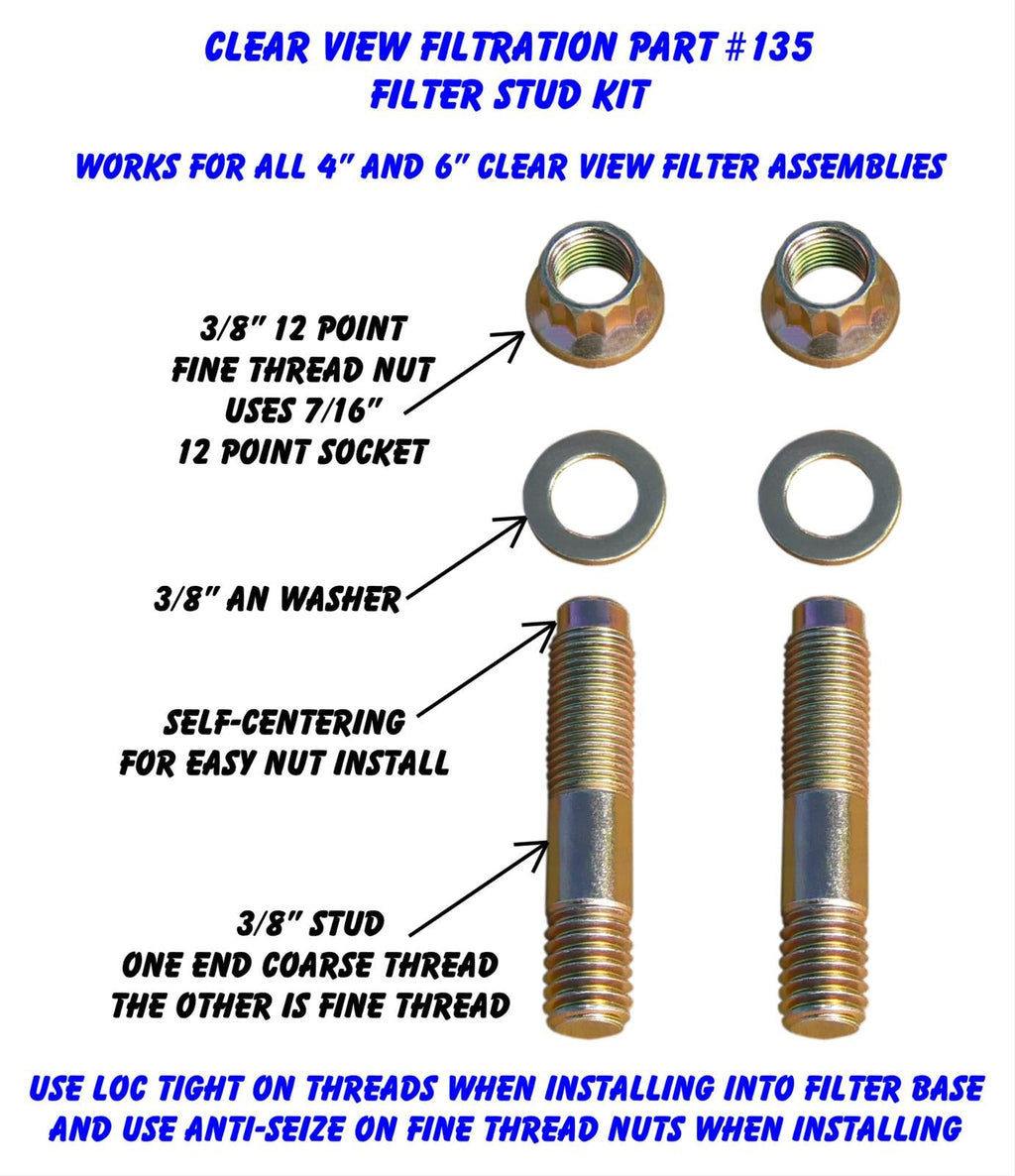 Clear View Filtration housing studs are replacement stud, washer, and nut kits to keep your See Through filter assemblies in positive, flawless condition. These stud kits will work on all their filter assemblies.Brand: Clear View Filtration