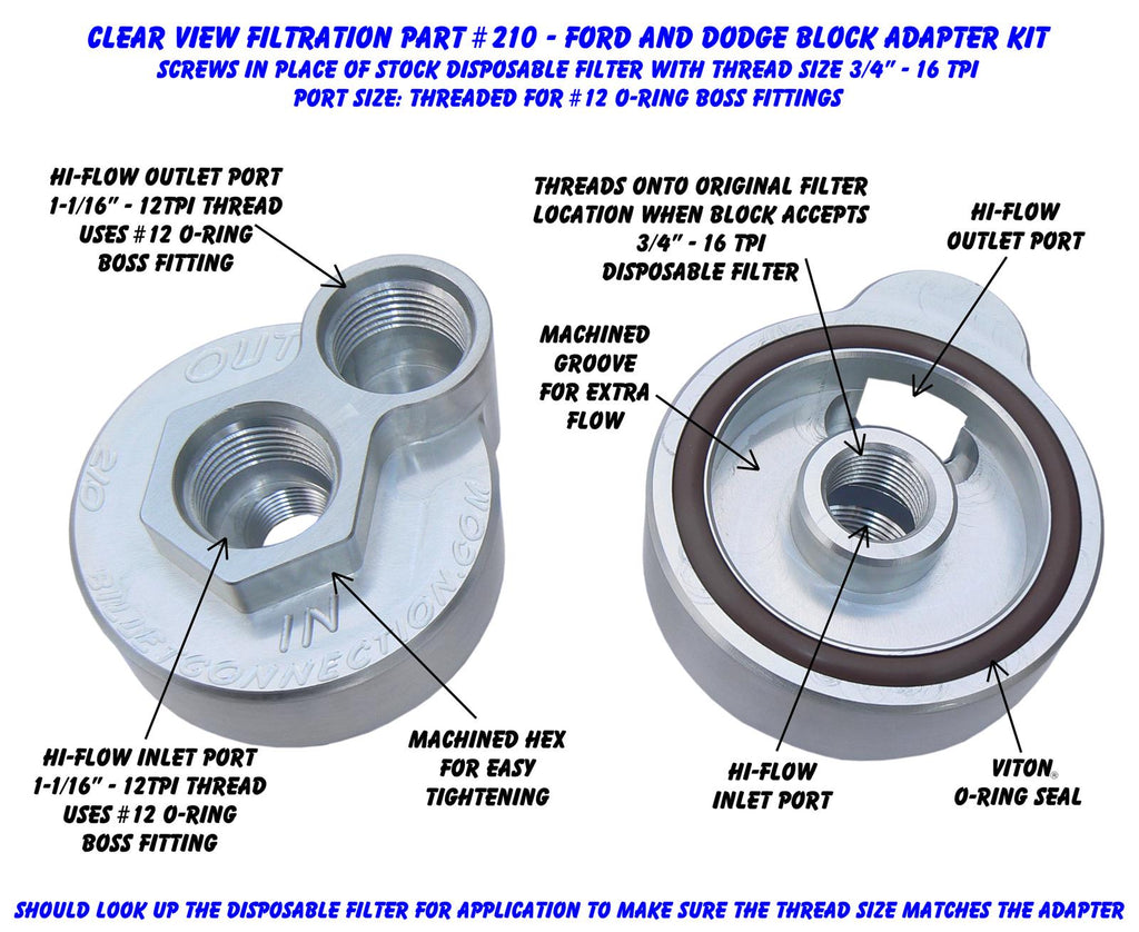Clear View Filtration oil filter block adapters are machined from 6061 billet aluminum and are either clear or black anodized for better protection. Block adapters feature a high-flow design for high-pressure and high-volume oil systems on today's performance and race engines. Clear View Filtration block adapters have been redesigned, so they will not restrict the flow of oil. Order the size recommended for your application.Brand: Clear View Filtration