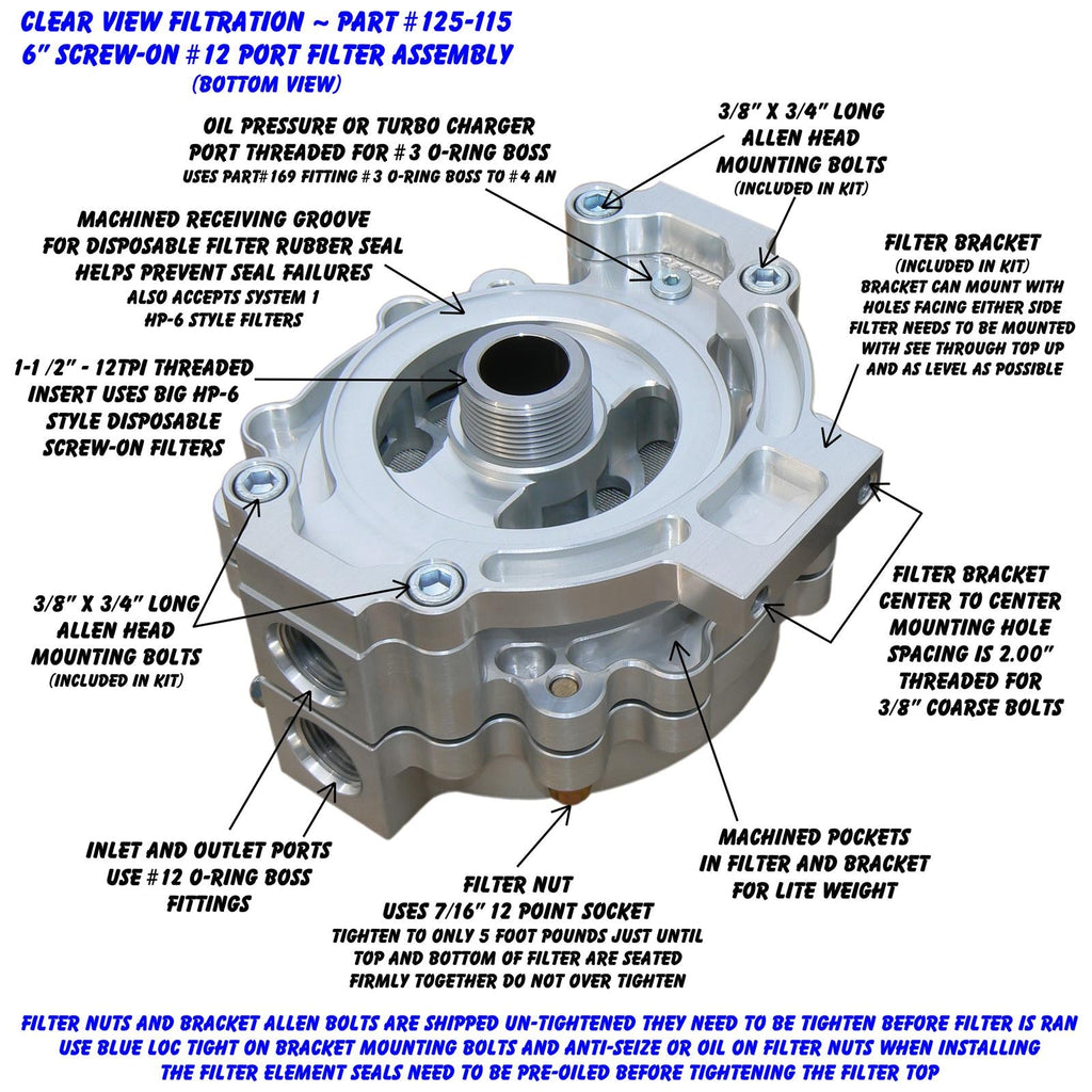 Clear View Filtration screw-on See Through oil filters are the future of oil filtration. These patented filter assemblies allow you to visually see oil pumping through the filter and determine the condition of the oil. Also, oil can be emptied out of the assembly in seconds, exposing the element and the filtered particles. This permits you to visually inspect particles and contaminants to determine if they are from normal use, or from bearings and other components excessively wearing in the engine or machinery. The high-flow, screw-on filters are available with a clear or black powdercoat finish. Each of the assemblies includes filter, reusable stainless steel mesh element, and bracket kit. Clear View Filtration See Through oil filters assemblies make engine oil inspection quick and easy.