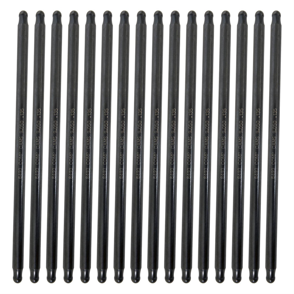 These COMP Cams Hi-Tech 210 degree pushrods were specifically designed for high-lift applications where pushrod and seat interference are problems at maximum lift. They're heat-treated to a minimum hardness of 60 on the Rockwell C scale, for the ultimate in strength. COMP Cams even gives them a black oxide finish and imprints the length and part number on them. In addition, they feature a 210 degree radius, rather than the standard 180 degree radius, so they'll work great with rocker arms that feature cup-type adjusters and applications requiring more load-bearing surface from the pushrod. If you are building a high-horsepower, high-rpm, high-lift camshaft engine, then you need to use these COMP Cams Hi-Tech 210 degree pushrods for maximum reliability.Brand: COMP Cams