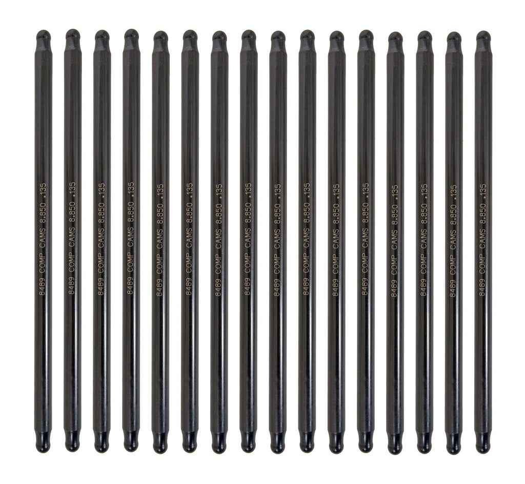 These COMP Cams Hi-Tech 210 degree pushrods were specifically designed for high-lift applications where pushrod and seat interference are problems at maximum lift. They're heat-treated to a minimum hardness of 60 on the Rockwell C scale, for the ultimate in strength. COMP Cams even gives them a black oxide finish and imprints the length and part number on them. In addition, they feature a 210 degree radius, rather than the standard 180 degree radius, so they'll work great with rocker arms that feature cup-type adjusters and applications requiring more load-bearing surface from the pushrod. If you are building a high-horsepower, high-rpm, high-lift camshaft engine, then you need to use these COMP Cams Hi-Tech 210 degree pushrods for maximum reliability.Brand: COMP Cams