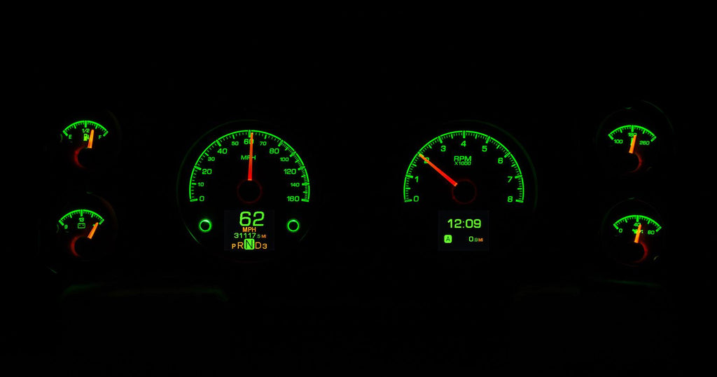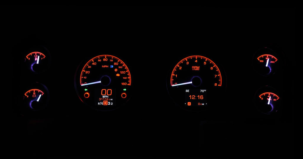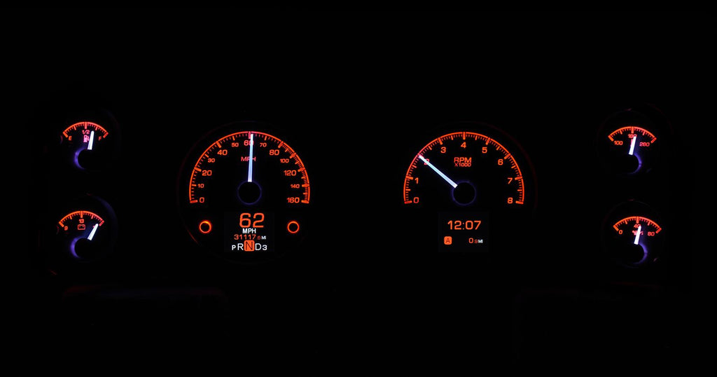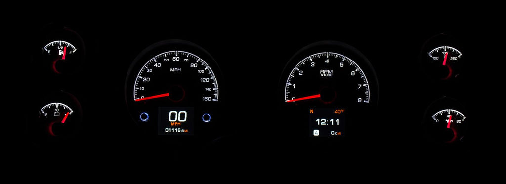 Dakota Digital HDX direct-fit analog gauge systems feature the latest in aftermarket automotive instrumentation technology. They take personalization and usability to a whole new dimension, while retaining your favorite features from the wildly popular VHX-Series, such as LED backlighting for the numbers, tick marks, and dead-faced dash indicators (turn signals, high beam, check engine, cruise control engaged, and parking brake). Illuminated needles and a lifetime warranty are still part of the deal as well. These features add up to clean, easy-to-read instrument systems in all conditions.