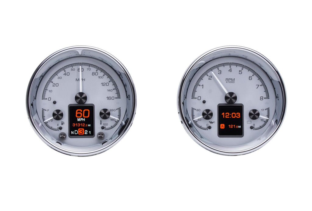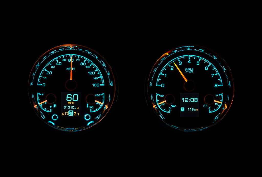 Notes: Two gauge kit. Indicators include: turn signals, high beam, check engine, and parking brake. Also includes cruise control, automatic transmission gear position, 4x4, and wait to start when vehicle is equipped. Message center has odometer, dual trip odometer, clock, estimated range/miles to empty, 0-60 timer, 1/8 mile and 1/4 mile timer/speed, high-speed, and high-rpm recall.