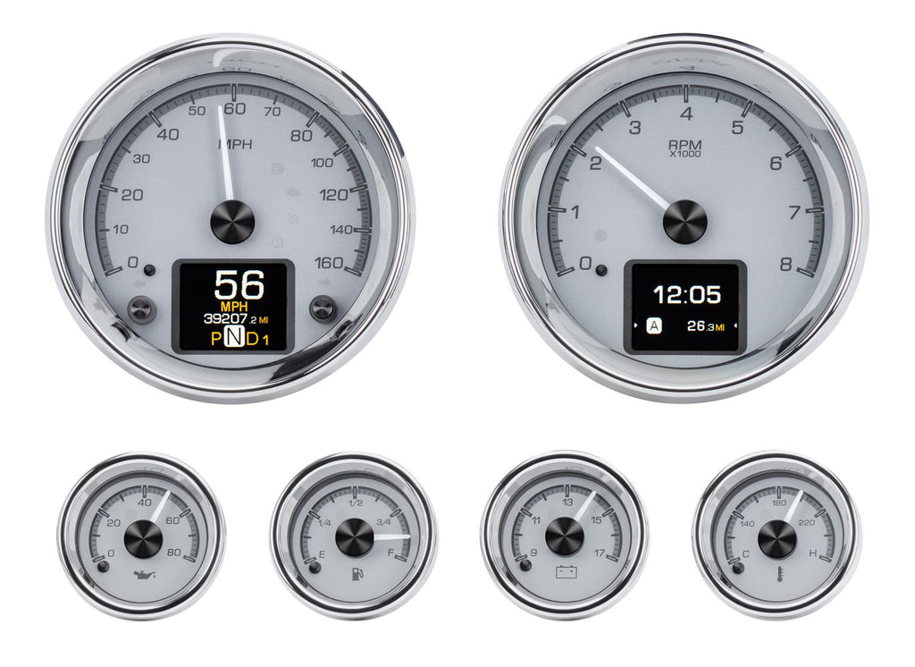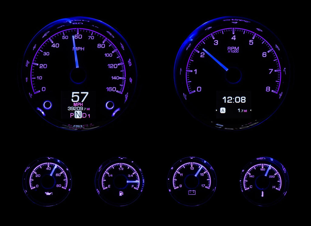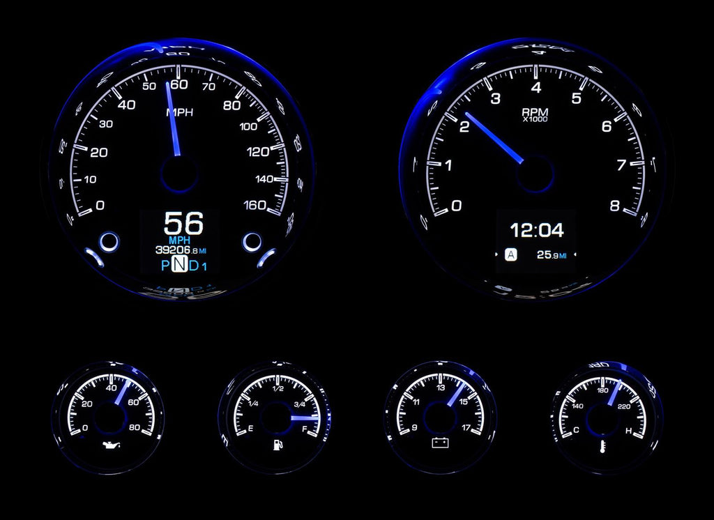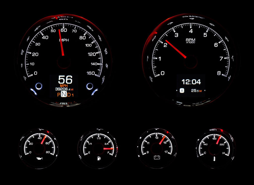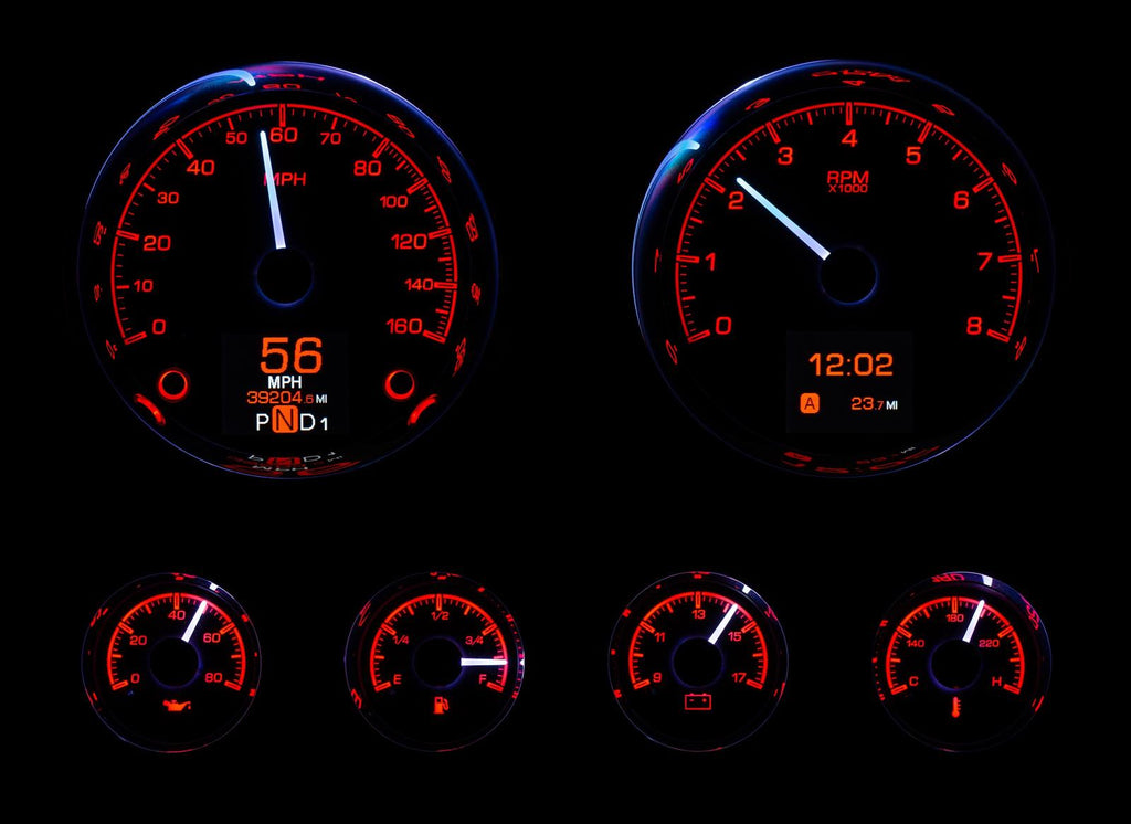Notes: Six gauge kit. Indicators include: turn signals, high beam, check engine, and parking brake. Also includes cruise control, automatic transmission gear position, 4x4, and wait to start when vehicle is equipped. Message center has odometer, dual trip odometer, clock, estimated range/miles to empty, 0-60 timer, 1/8 mile and 1/4 mile timer/speed, high-speed, and high-rpm recall.