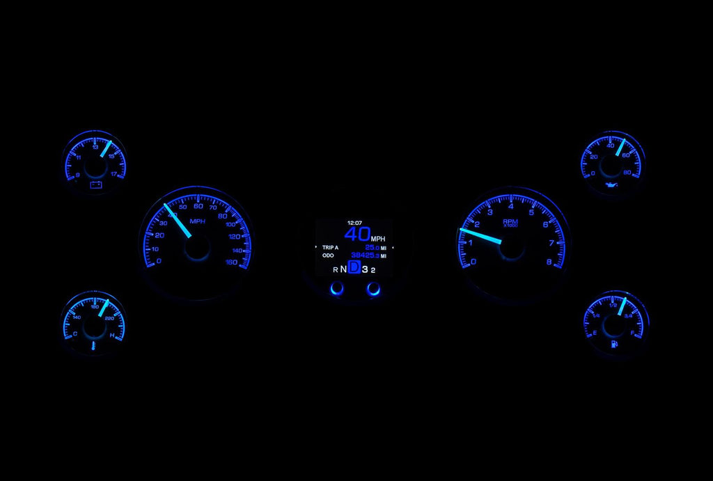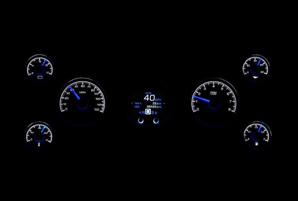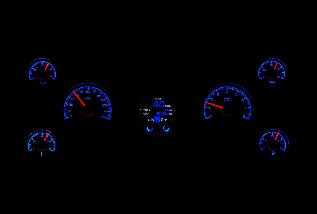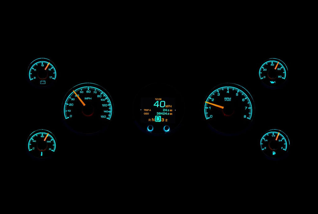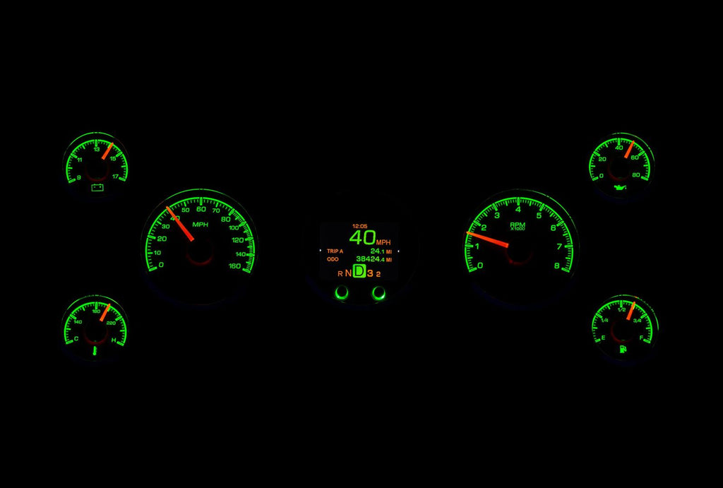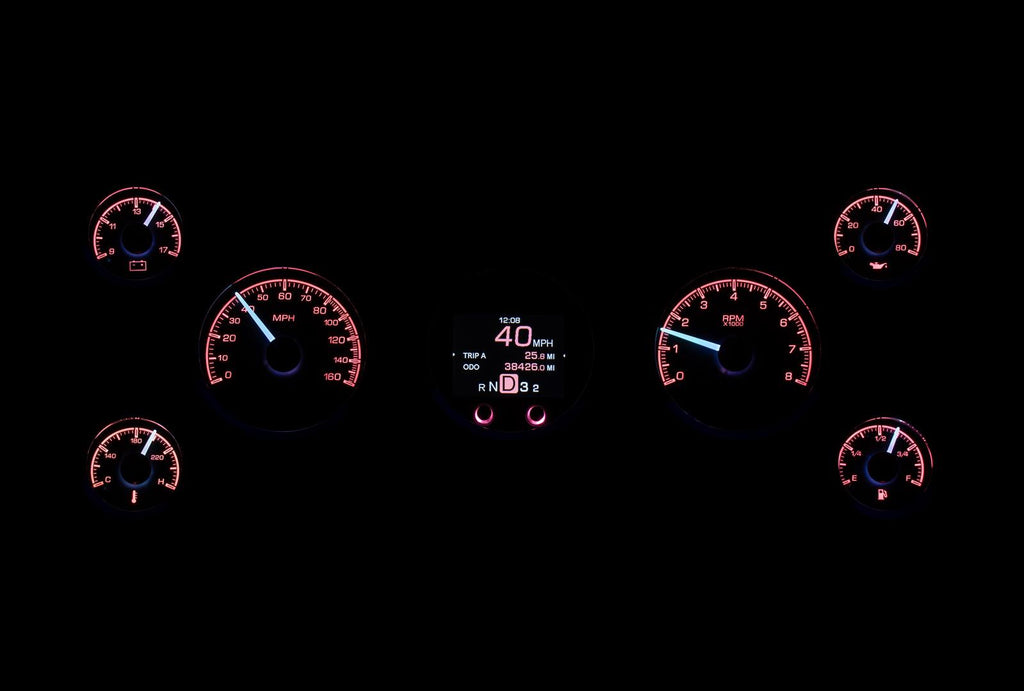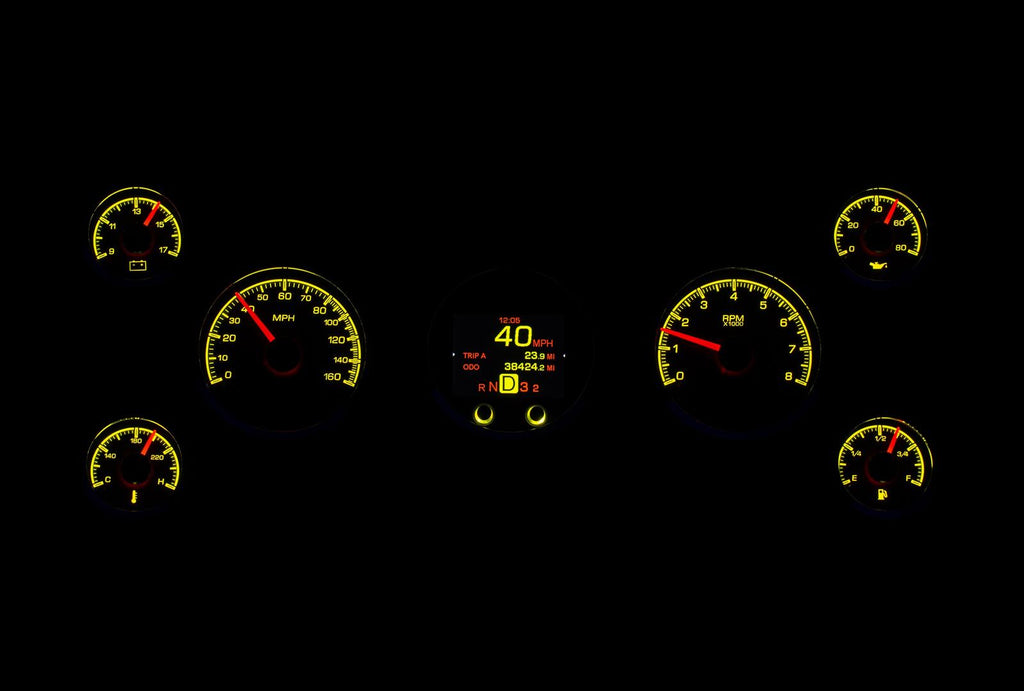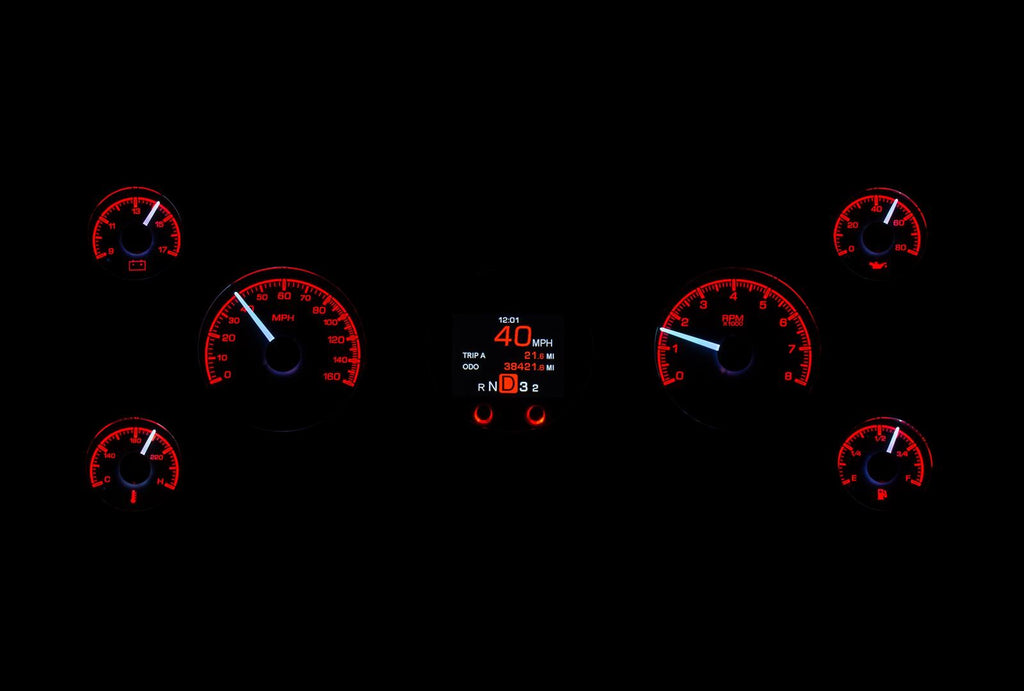 Notes: Seven gauge kit. Indicators include: turn signals, high beam, check engine, and parking brake. Also includes cruise control, automatic transmission gear position, 4x4, and wait to start when vehicle is equipped. Message center has odometer, dual trip odometer, clock, estimated range/miles to empty, 0-60 timer, 1/8 mile and 1/4 mile timer/speed, high-speed, and high-rpm recall.