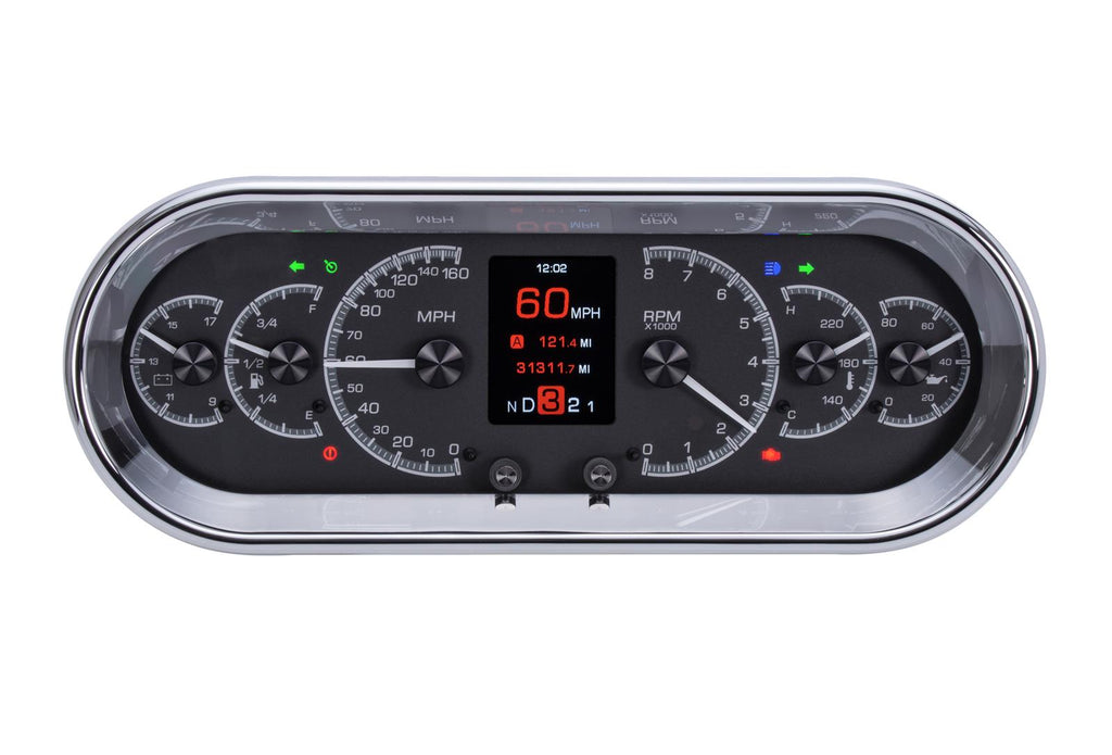 Dakota Digital HDX Series universal rounded rectangle analog gauge kits offer a beautiful one-piece solution for your instrument panel needs. Total depth behind the dash is just 2 in.--a real feat considering the six analog gauge readings plus a large, full-color TFT message center. Integrated capacitive touch switches and supplied sending units, plus BIM Series compatibility makes this package your instrumentation solution. Housing and integrated front bezel are billet aluminum and show chrome plated. All HDX instrument systems feature dead-faced indicators (turn signals, high beam, check engine, cruise control, parking brake, plus two user-definable) and a red, settable warning light for each gauge. They're available in either standard or metric versions. Craft the perfect, one-off dashboard with Dakota Digital HDX Series universal rounded rectangle analog gauge kits.