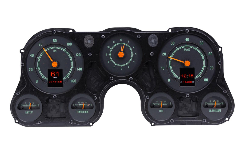 Dakota Digital RTX direct-fit gauge kits retain your classic vehicle's stock look without sacrificing the late-model features you love. Every effort was made to incorporate OEM design elements regarding the layout, face styling, and indicators. Starting from scratch, these CNC-machined cluster housings are filled with electronics that raise the bar--in fact, the high-def message centers can be configured to display just about any piece of information needed. The RTX Series utilizes a central control box to make installation and setup as easy as possible. Choose the model with gauges and features designed to fit your specific vehicle.Brand: Dakota Digital