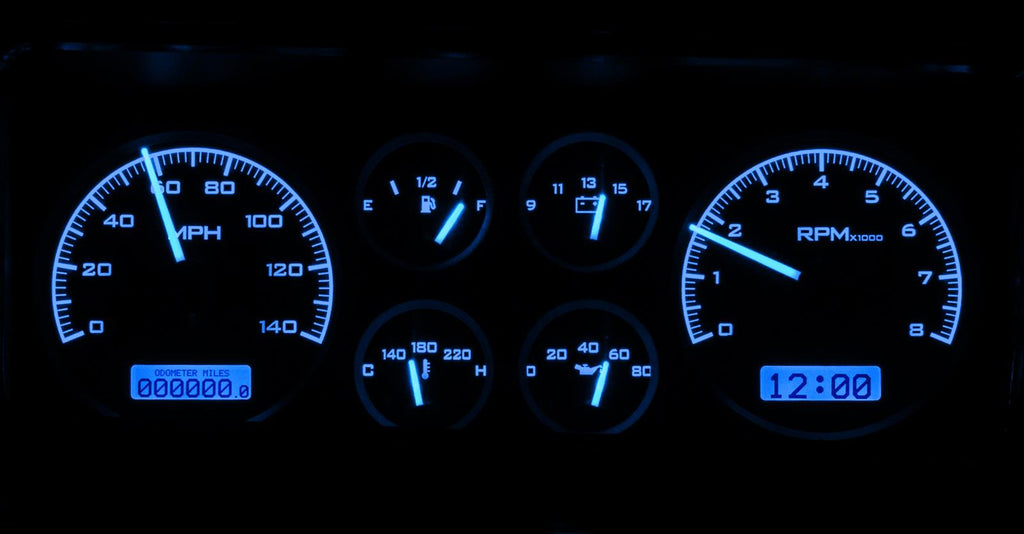 Notes: Black alloy gauge face, numbers, and pointer illuminate blue at night. Fits factory bezel, bezel not included. Will not fit rectangular sweep-style speedometer cluster.