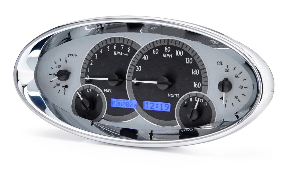 Inspired by the iconic 1932 Ford instrument cluster, Dakota Digital VHX Elliptical Series analog gauge kits are housed in a billet aluminum, show-chromed housing. These VHX gauge clusters provide indicators for more than 20 automotive levels, speeds, and functions--everything you need in one stylish oval dash panel replacement. And, at just 2.5 in. deep, these instrument panels can be used even in the most cramped applications. Dakota Digital VHX Elliptical Series analog gauge kits are available in your choice of illumination colors, such as blue, red, and white, as well as gauge face finishes, like black, silver, and carbon fiber. Put some shiny new compact instrumentation in your ride!Brand: Dakota Digital