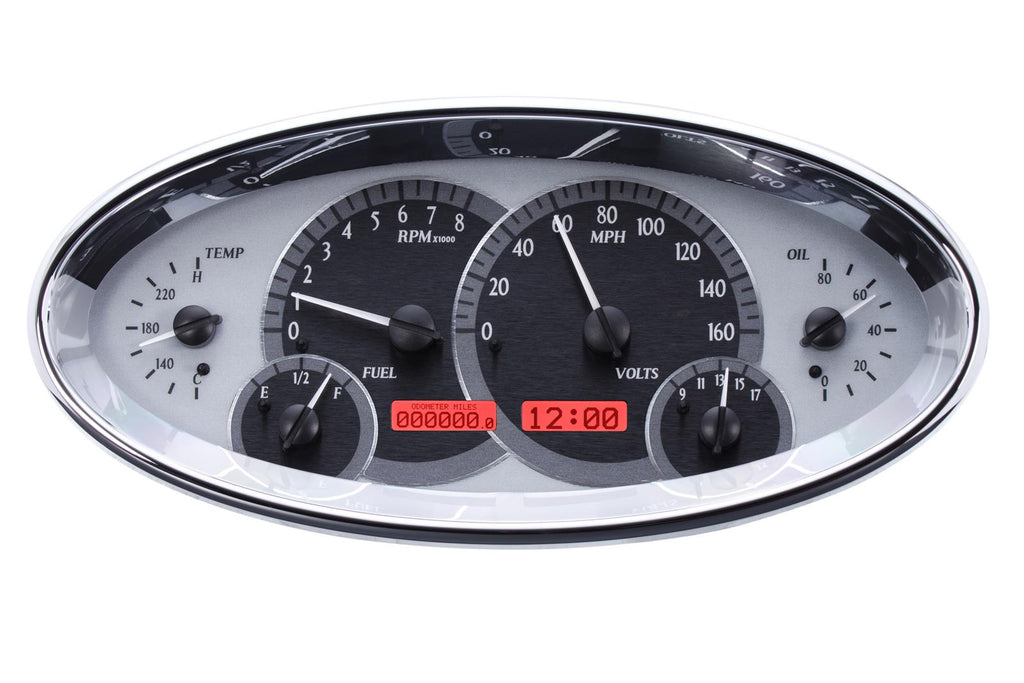 Inspired by the iconic 1932 Ford instrument cluster, Dakota Digital VHX Elliptical Series analog gauge kits are housed in a billet aluminum, show-chromed housing. These VHX gauge clusters provide indicators for more than 20 automotive levels, speeds, and functions--everything you need in one stylish oval dash panel replacement. And, at just 2.5 in. deep, these instrument panels can be used even in the most cramped applications. Dakota Digital VHX Elliptical Series analog gauge kits are available in your choice of illumination colors, such as blue, red, and white, as well as gauge face finishes, like black, silver, and carbon fiber. Put some shiny new compact instrumentation in your ride!Brand: Dakota Digital