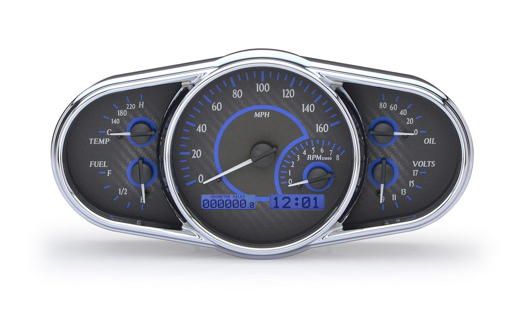Dakota Digital Multi-Level Elliptical VHX Series analog gauge kits find themselves at home in many custom-built dashboards. A unique stepped bezel gives a one-of-a-kind, 3-dimensional look that brings out the quality of the show-chrome plating--and the 20 various gauge displays include everything from speeds and engine levels … to lights and time. The control module and all required sensors are included. Additionally, the gauge clusters feature fully lit needles, backlit faces, solid-state sensors for accuracy, highly visible LCD message centers, user-customizable display feedback, and more. It's all packaged in a triple chrome plated, machined aluminum gauge housing--wow! Dakota Digital offers your choice of colors for the background face, numbers, and numeric illumination.Brand: Dakota Digital