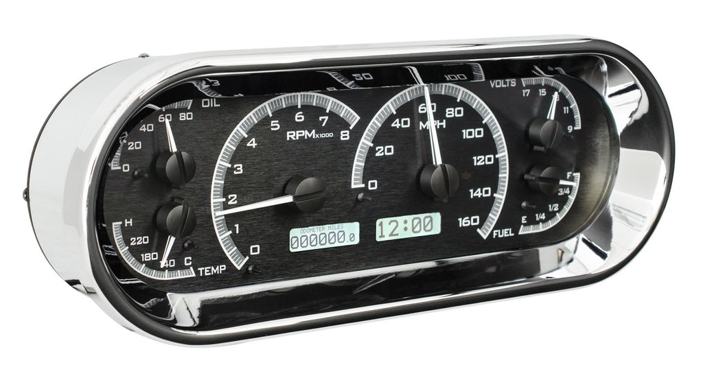 Dakota Digital recessed oval VHX Series analog gauge kits offer great visibility and features in a compact package. The panel unit includes indicators for your turn signals, high-beams, parking brake, cruise control, and check engine light. The message center has an odometer, trip odometer, clock, gear indicator, 0 to 60 timer, quarter-mile timer/speed, high-speed, and high-rpm recall (control module and required sensors are included)--more than 20 indicators in all! Graceful instrument housing in flawless chrome plating complements the backlit VHX system, making these gauge kits a classy option that fits most vehicles. You can further customize the dashboard with your choice of colors for the face, digits/needles, and illumination. Say goodbye to stock gauges, and hello to the Dakota Digital VHX Series analog gauge kits.Brand: Dakota Digital