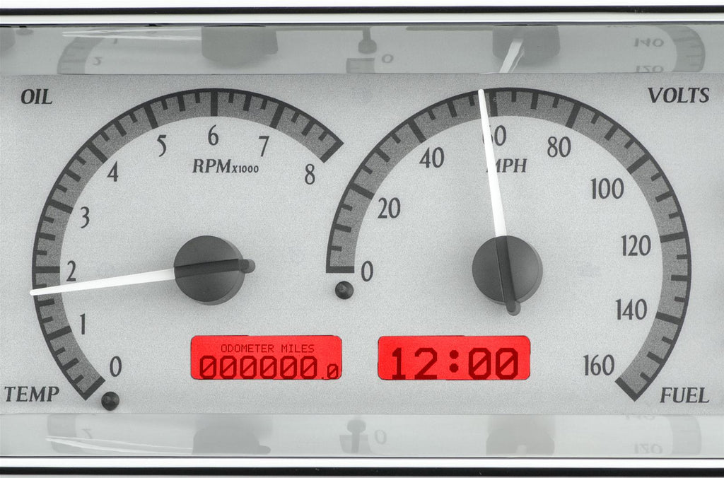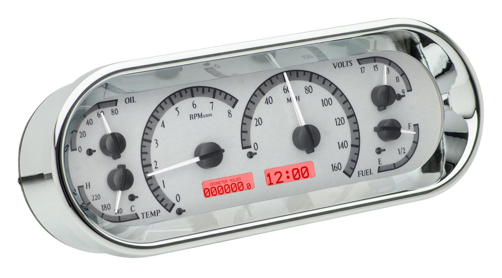 Dakota Digital recessed oval VHX Series analog gauge kits offer great visibility and features in a compact package. The panel unit includes indicators for your turn signals, high-beams, parking brake, cruise control, and check engine light. The message center has an odometer, trip odometer, clock, gear indicator, 0 to 60 timer, quarter-mile timer/speed, high-speed, and high-rpm recall (control module and required sensors are included)--more than 20 indicators in all! Graceful instrument housing in flawless chrome plating complements the backlit VHX system, making these gauge kits a classy option that fits most vehicles. You can further customize the dashboard with your choice of colors for the face, digits/needles, and illumination. Say goodbye to stock gauges, and hello to the Dakota Digital VHX Series analog gauge kits.Brand: Dakota Digital