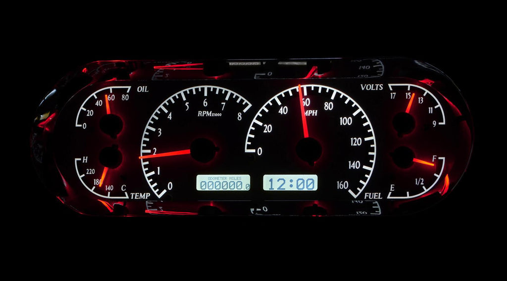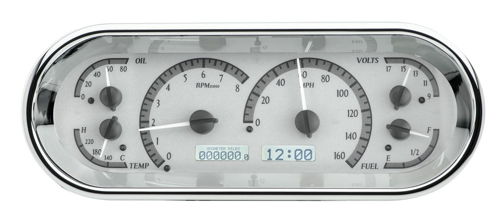 Dakota Digital recessed oval VHX Series analog gauge kits offer great visibility and features in a compact package. The panel unit includes indicators for your turn signals, high-beams, parking brake, cruise control, and check engine light. The message center has an odometer, trip odometer, clock, gear indicator, 0 to 60 timer, quarter-mile timer/speed, high-speed, and high-rpm recall (control module and required sensors are included)--more than 20 indicators in all! Graceful instrument housing in flawless chrome plating complements the backlit VHX system, making these gauge kits a classy option that fits most vehicles. You can further customize the dashboard with your choice of colors for the face, digits/needles, and illumination. Say goodbye to stock gauges, and hello to the Dakota Digital VHX Series analog gauge kits.Brand: Dakota Digital