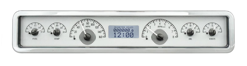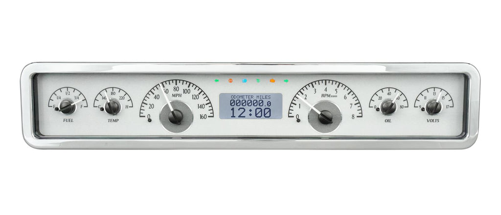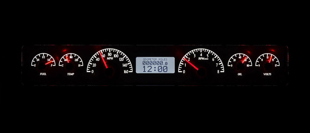 Bring your classic up to date with all-new instrumentation! Dakota Digital universal rectangle VHX Series analog gauge kits can add a unique look and informative panel to your dash configuration. These units include the following displays: water temperature, speedometer, tachometer, oil pressure, fuel level, and voltmeter. The message center features an odometer, trip odometer, clock, gear indicator, 0 to 60 timer, quarter-mile timer/speed, high-speed, and high-rpm recall (control module and required sensors are included). Dakota Digital analog gauge kits are offered in your choice of face finishes and illumination colors to freshen up the look of your ride's interior!Brand: Dakota Digital