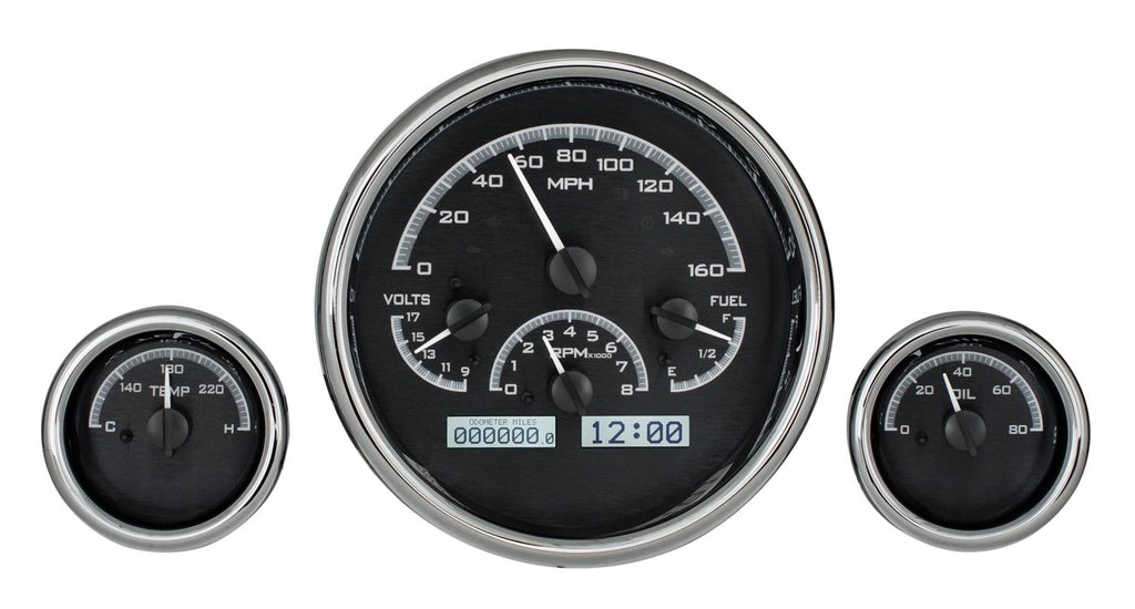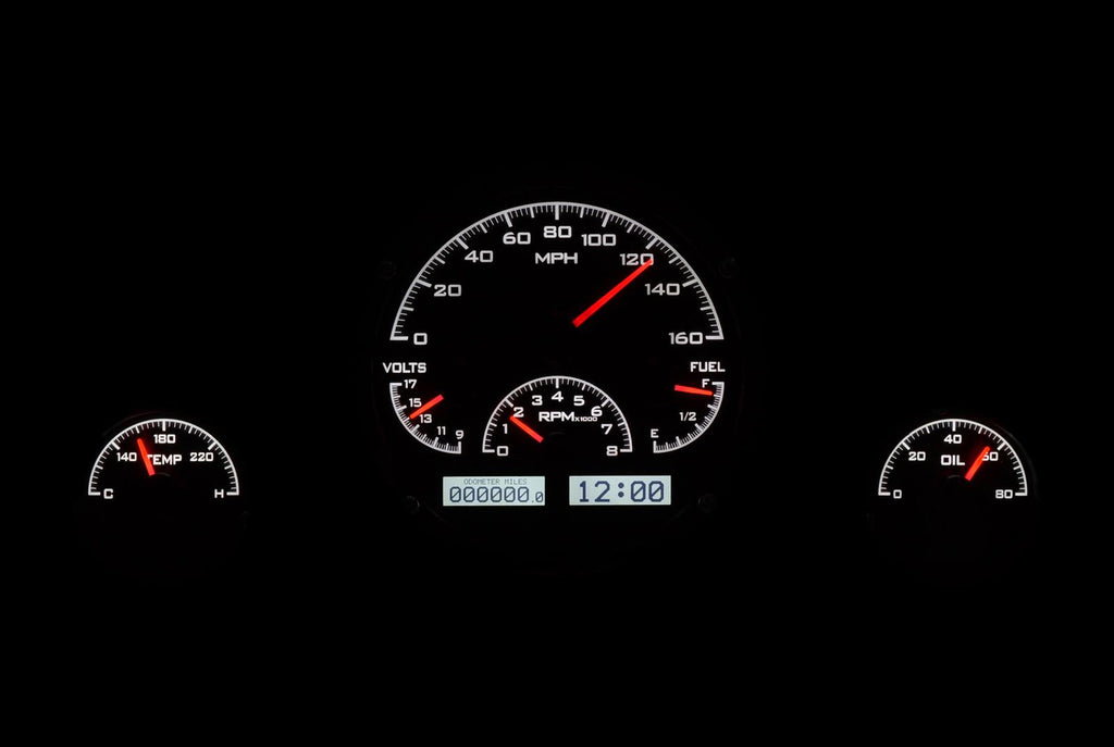 Dakota Digital universal round VHX Series analog gauge kits introduce a new look in a traditional layout. The circular gauge format has been a design staple for generations, allowing flexibility in nearly any type of vehicle--and this distinctive line offers vital information in a variety of configurations … from one single gauge, to a cluster of six! VHX dials provide accurate feedback on at least 20 automotive levels, speeds, and functions; and bringing the vintage dashboard displays into the 21st century are bright LCD message centers, backlit faces, and fully lit needles. These gauge kits are equally impressive behind the scenes, with solid-state sensors, precision stepper motors, and customizable data readouts. Choose the colors you prefer on the face and digits; everything will be encased in a chromed billet aluminum housing with polished bezel. Dakota Digital gauges have revolutionized the industry--just think what they'll do for your driving experience!Brand: Dakota Digital