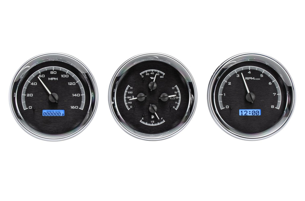 Dakota Digital universal round VHX Series analog gauge kits introduce a new look in a traditional layout. The circular gauge format has been a design staple for generations, allowing flexibility in nearly any type of vehicle--and this distinctive line offers vital information in a variety of configurations … from one single gauge, to a cluster of six! VHX dials provide accurate feedback on at least 20 automotive levels, speeds, and functions; and bringing the vintage dashboard displays into the 21st century are bright LCD message centers, backlit faces, and fully lit needles. These gauge kits are equally impressive behind the scenes, with solid-state sensors, precision stepper motors, and customizable data readouts. Choose the colors you prefer on the face and digits; everything will be encased in a chromed billet aluminum housing with polished bezel. Dakota Digital gauges have revolutionized the industry--just think what they'll do for your driving experience!Brand: Dakota Digital