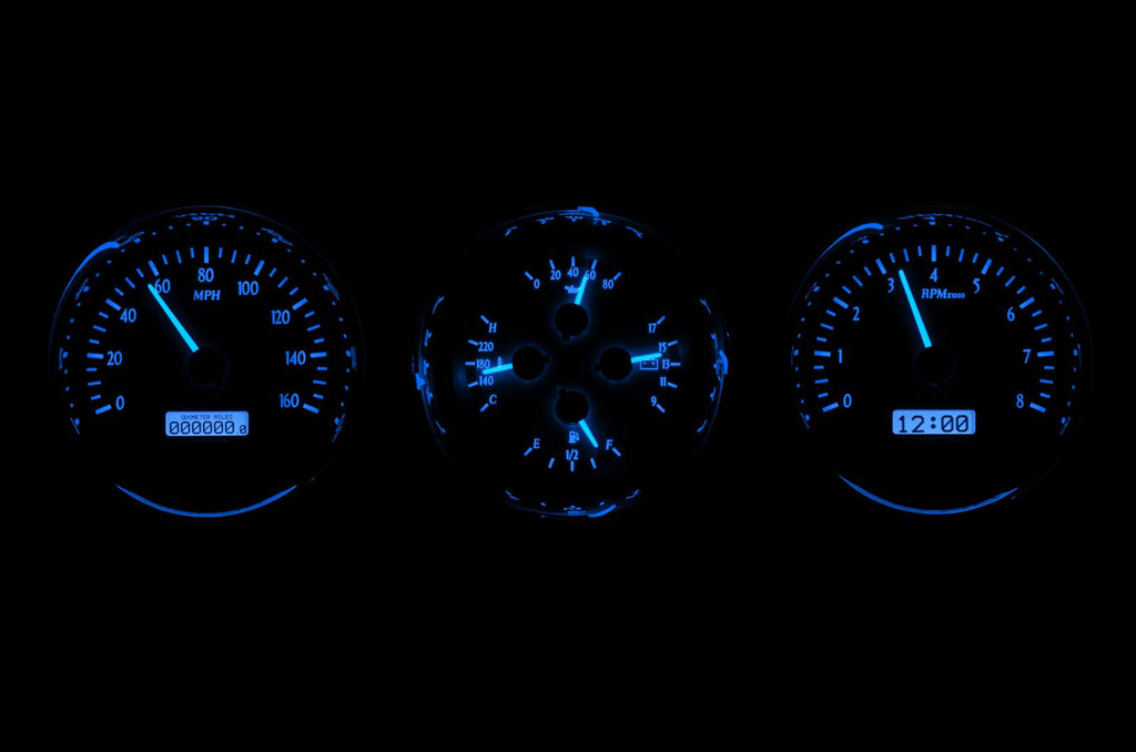 Dakota Digital universal round VHX Series analog gauge kits introduce a new look in a traditional layout. The circular gauge format has been a design staple for generations, allowing flexibility in nearly any type of vehicle--and this distinctive line offers vital information in a variety of configurations … from one single gauge, to a cluster of six! VHX dials provide accurate feedback on at least 20 automotive levels, speeds, and functions; and bringing the vintage dashboard displays into the 21st century are bright LCD message centers, backlit faces, and fully lit needles. These gauge kits are equally impressive behind the scenes, with solid-state sensors, precision stepper motors, and customizable data readouts. Choose the colors you prefer on the face and digits; everything will be encased in a chromed billet aluminum housing with polished bezel. Dakota Digital gauges have revolutionized the industry--just think what they'll do for your driving experience!Brand: Dakota Digital