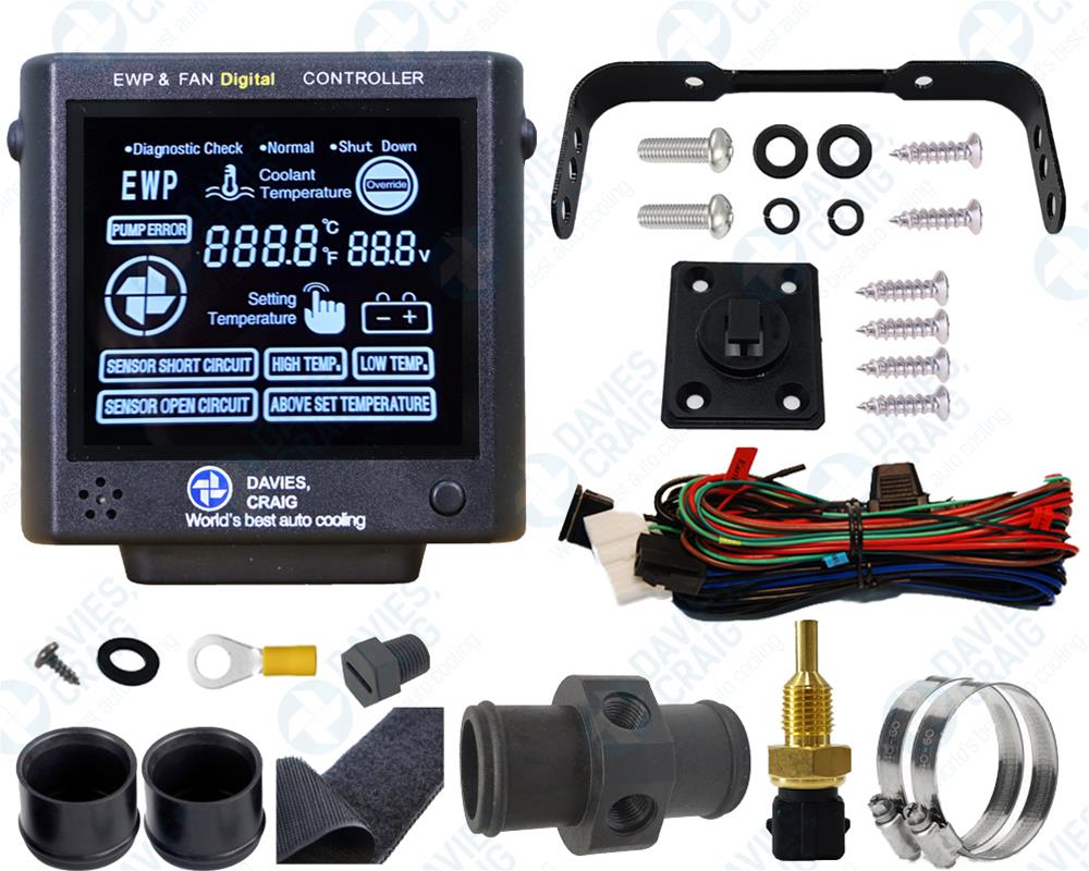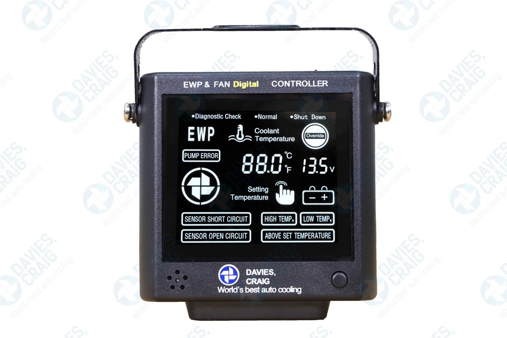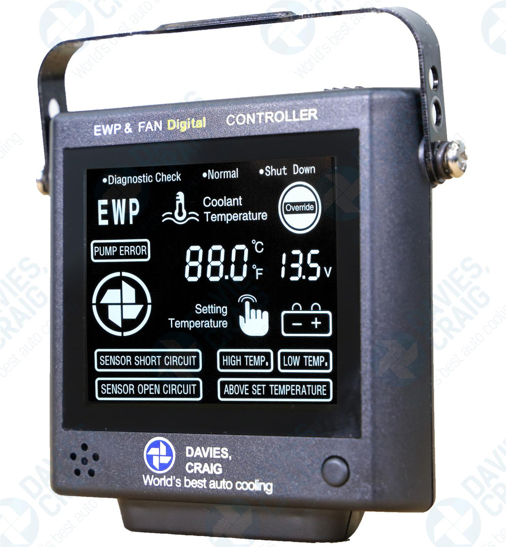 Davies Craig electric water pump and fan controllers manage the operation of your chosen EWP by varying the speed of your pump in response to coolant temperature, while also managing control of your electric engine fan. These unique LCD controllers are enhanced with many features that help you set target temperatures to improve fuel efficiency, reduce heat soak, and increase power.