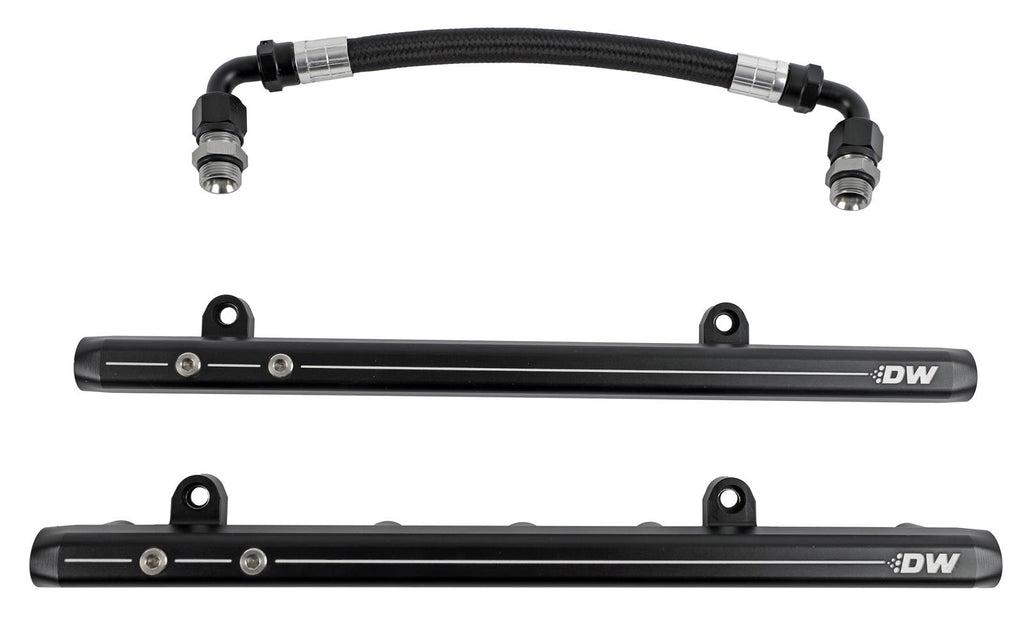 DeatschWerks fuel rails offer the quality, performance and flexibility that fits your fueling needs. These vehicle-specific fuel rails offer higher flow, more plumbing options, and several unique features that go beyond what is currently available in the market. Engineered for use in both return and returnless configurations, these fuel rails are CNC-machined from billet aluminum, then are hard anodized in a black finish and feature integrated CNC brackets to provide easy bolt-on installation. In addition, DW's engineers invested significant design time with their fuel rails by removing excess material to shave weight and create a sleek signature look resulting in a component that looks as good as it performs. Order the DeatschWerks fuel rail model recommended for your application.Brand: DeatschWerks
