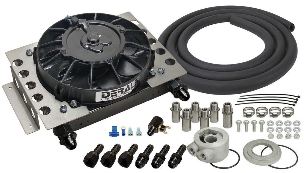 Why compromise your engine or transmission's life when you can insure it with Derale Atomic-Cool remote fluid coolers. These efficient coolers provide the largest temperature drop of any of Derale's fan-equipped coolers. Their fin-and-plate design minimizes pressure drops, even with high-viscosity oils; and the attached electric fan provides optimum heat extraction regardless of mounting location. Atomic-Cool coolers from Derale Performance come with several styles of inlet and outlet fittings, including hose-barb adapters. You can make these coolers work even better with the fan thermostats and installation kits that are sold separately.Brand: Derale Cooling Products