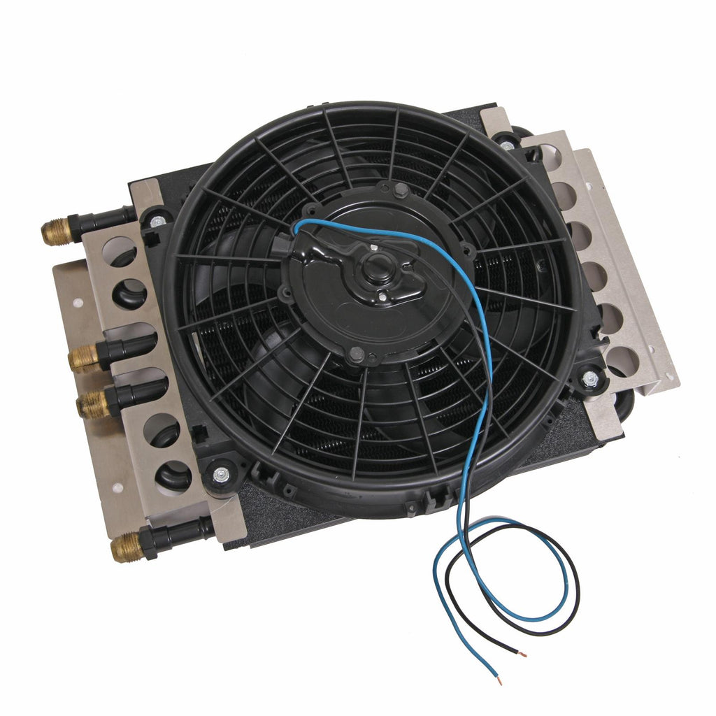 Derale Electra-Cool remote fluid coolers combine a high-capacity oil cooler core with a Tornado 10 in. electric fan for maximum cooling in any environment. This superior combination will give you the peace of mind of knowing that your fluids will be at their prime operating temperatures. These coolers feature a core with 1/2 in. copper tubes and 3/4 in. aluminum fins with plastic edge-guard protectors, all with a durable black powdercoated finish. Each fan is solidly mounted to the cooler core with clear anodized billet aluminum brackets to ensure a stable attachment. Derale Performance coolers come in 8 or 16-pass models with your choice of AN-type inlets and outlets.