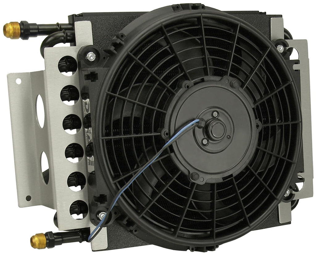 Derale Electra-Cool remote fluid coolers combine a high-capacity oil cooler core with a Tornado 10 in. electric fan for maximum cooling in any environment. This superior combination will give you the peace of mind of knowing that your fluids will be at their prime operating temperatures. These coolers feature a core with 1/2 in. copper tubes and 3/4 in. aluminum fins with plastic edge-guard protectors, all with a durable black powdercoated finish. Each fan is solidly mounted to the cooler core with clear anodized billet aluminum brackets to ensure a stable attachment. Derale Performance coolers come in 8 or 16-pass models with your choice of AN-type inlets and outlets.