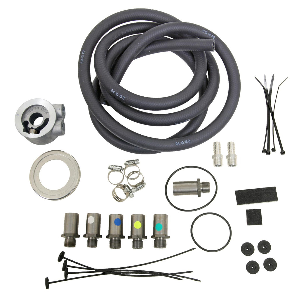 Notes: Kit includes a 3/8 in. NPT sandwich adapter; 3/4 in. -16, 13/16 in. -16, 18 x 1.5mm, 20 x 1.5mm and 22 x 1.5mm sleeve nuts, 10 ft.. of 1/2 in. transmission cooler hose, hose barb fittings, mounting kit and hose clamps.